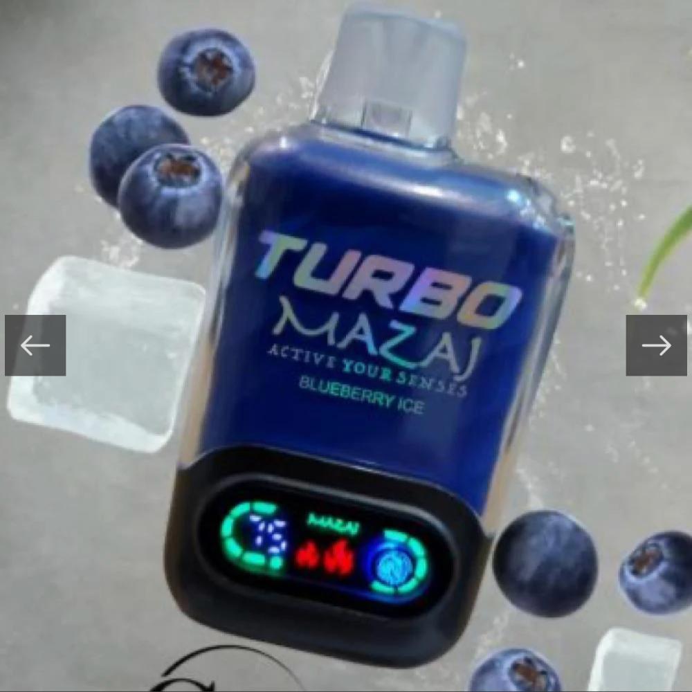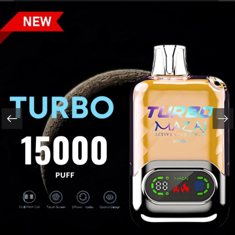 نقدم لكم سحبه مزاج تيربو 15000 سحبة Mazaj Turbo 15000 Puff بطارية 850 ملي امبير و 22 مل من النكهة و نظام تحكم تتش و شاشة عرض ذكية و نظام تحكم بالاير فلو و خيارات نيكوتين 50 مج
